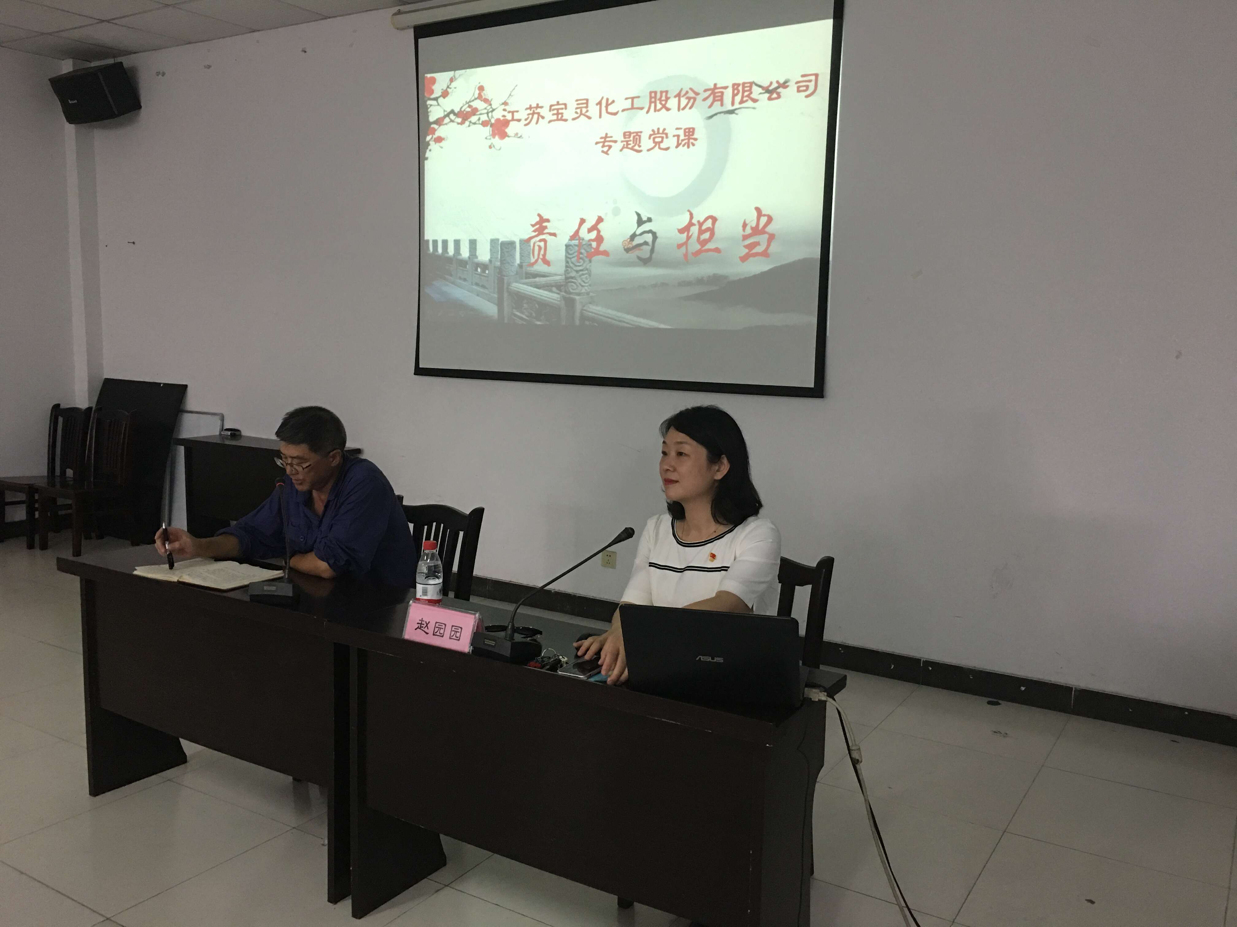 為深入學(xué)習(xí)貫徹黨的十九大精神和習(xí)近平新時(shí)代中國特色社會(huì)主義思想,紀(jì)念建黨 97 周年,堅(jiān)定理想信念,加強(qiáng)黨性修養(yǎng),寶靈化工黨委在6月底按期完成省、市委組織部《關(guān)于召開“進(jìn)一步解放思想,激勵(lì)新時(shí)代新?lián)?dāng)新作為”專題組織生活會(huì)》的基礎(chǔ)上,于7月19日下午組織全體黨員干部、入黨積極分子近六十人,舉行了“責(zé)任與擔(dān)當(dāng)”專題黨性教育,特邀南通市委黨校趙園園博士前來公司作《責(zé)任與擔(dān)當(dāng)》黨課輔導(dǎo)。7月23日的辦公會(huì)上,朱文新董事長又進(jìn)一步強(qiáng)調(diào),全體黨員干部必須立足本職本崗,做到“對待工作極端盡責(zé),難題面前勇于負(fù)責(zé),出現(xiàn)過失敢于擔(dān)責(zé)”,把一個(gè)黨員干部該擔(dān)當(dāng)?shù)呢?zé)任體現(xiàn)到干事創(chuàng)業(yè)、奮發(fā)有為的具體行動(dòng)上。