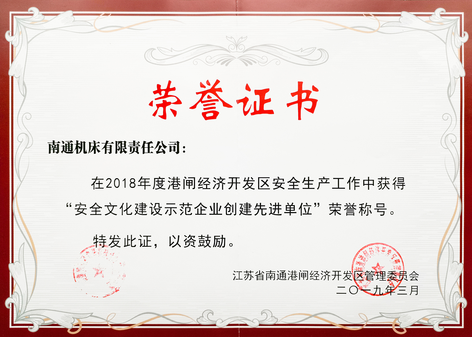 近日,南通市港閘區(qū)政府表彰了2018年度港閘經(jīng)濟(jì)開發(fā)區(qū)安全生產(chǎn)先進(jìn)集體和先進(jìn)個(gè)人。南通機(jī)床獲 “安全文化建設(shè)示范企業(yè)創(chuàng)建先進(jìn)單位”榮譽(yù)稱號(hào)。
