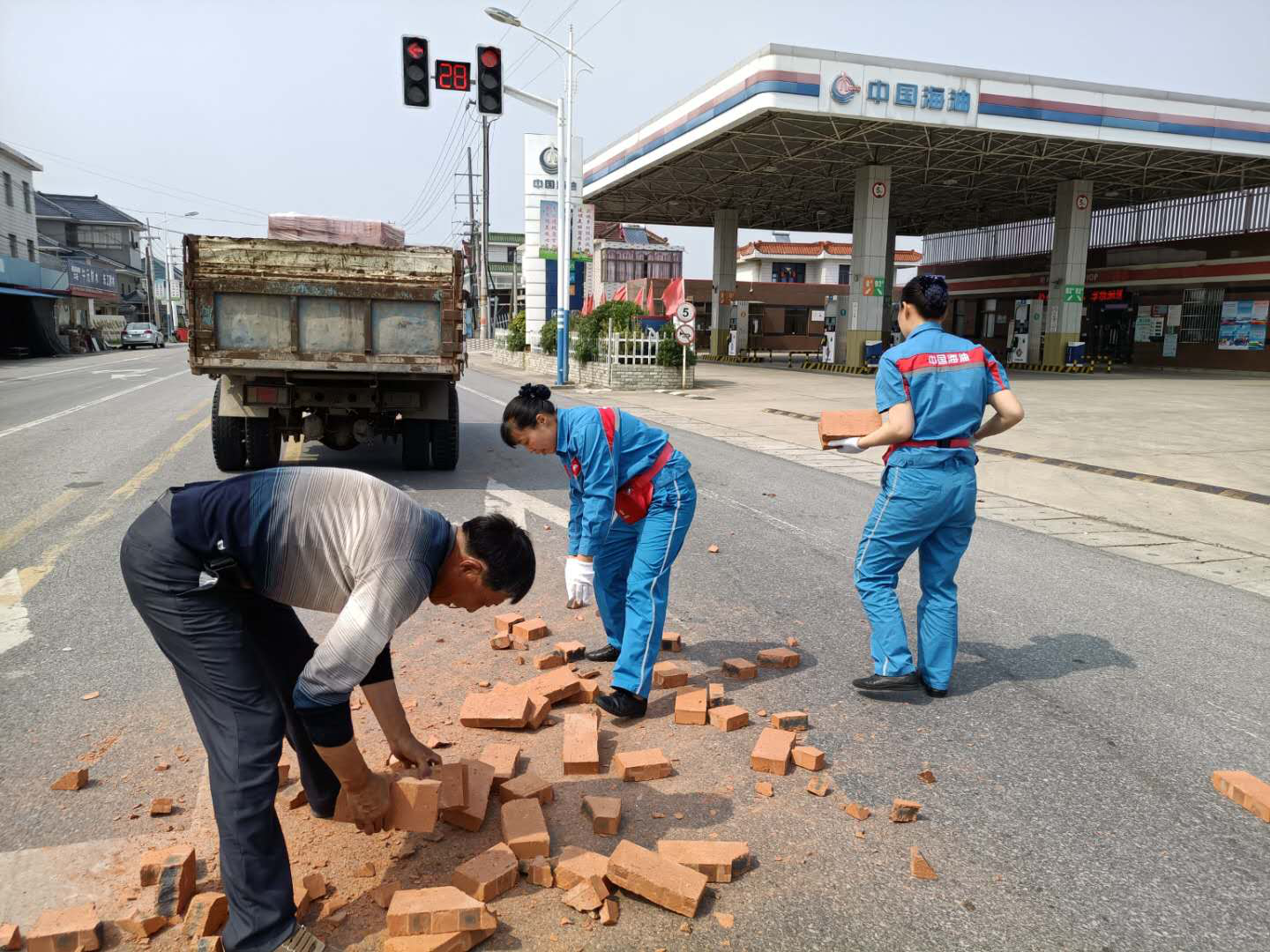 夏天的中午,天氣炎熱,似乎連樹上的知了也停止了歌唱。華東銷售南通公司栟茶加油站站前道路,似乎和往常一樣,車輛人流來來往往,當班的繆小紅和蔡翠和頂著炎熱在加油島上等待下一個顧客來加油。突然,“吱呀~~~”一個急剎,一輛避讓行人的運磚車差點翻車,晃悠了幾次總算停穩(wěn)了,但是車上的磚塊紛紛滾落。后方行駛的車輛有些來不及避讓,差點釀成新的事故,散落的磚塊對道路交通安全構成隱患。司機驚魂未定,趕忙下車查看,立刻開始將散落在道路上的磚往車上搬。