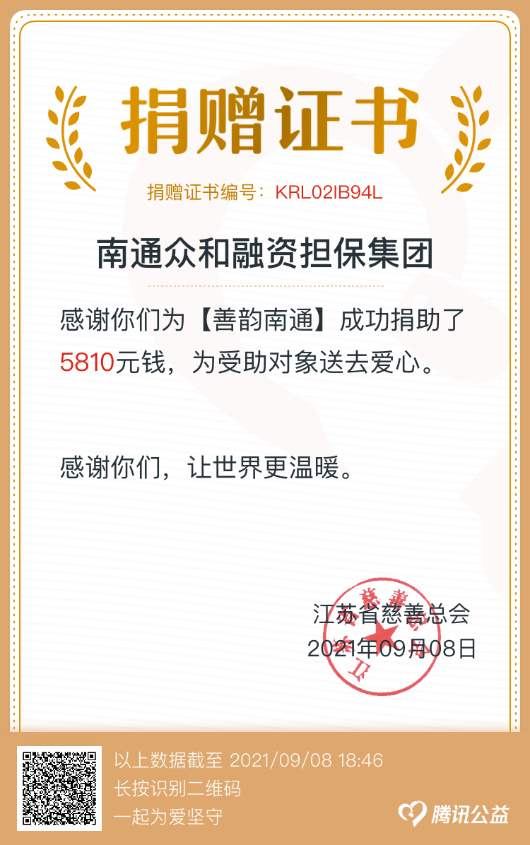 為進(jìn)一步弘揚(yáng)中華民族扶貧濟(jì)困的傳統(tǒng)美德,倡導(dǎo)“以人為本,樂(lè)于奉獻(xiàn)”的互助精神,眾和擔(dān)保積極發(fā)動(dòng)發(fā)動(dòng)、廣泛宣傳,第一時(shí)間組織全體干部職工開(kāi)展“慈善一日捐”活動(dòng)。公司領(lǐng)導(dǎo)班子成員率先垂范,帶頭捐款,全體干部職工踴躍參與,奉獻(xiàn)愛(ài)心,參與度100%。截至9月8日,共籌得善款5810元,募集資金將統(tǒng)一交至南通市慈善總會(huì),用于扶貧、慈善救助項(xiàng)目。