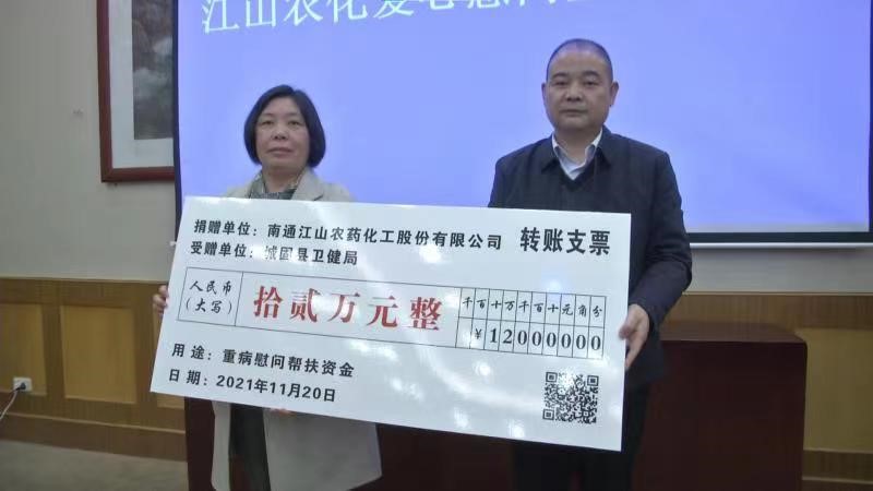 11月19-21日,江山股份參與南通開發(fā)區(qū)管委會組織的蘇陜協(xié)助考察交流活動,在城固縣-南通開發(fā)區(qū)對口協(xié)助交流座談會暨第十五次聯席會上,江山股份代表與城固縣衛(wèi)健局簽訂《城固縣重病戶慰問幫扶協(xié)議》,并捐贈十二萬元用于幫扶城固縣40戶重病戶困難家庭。