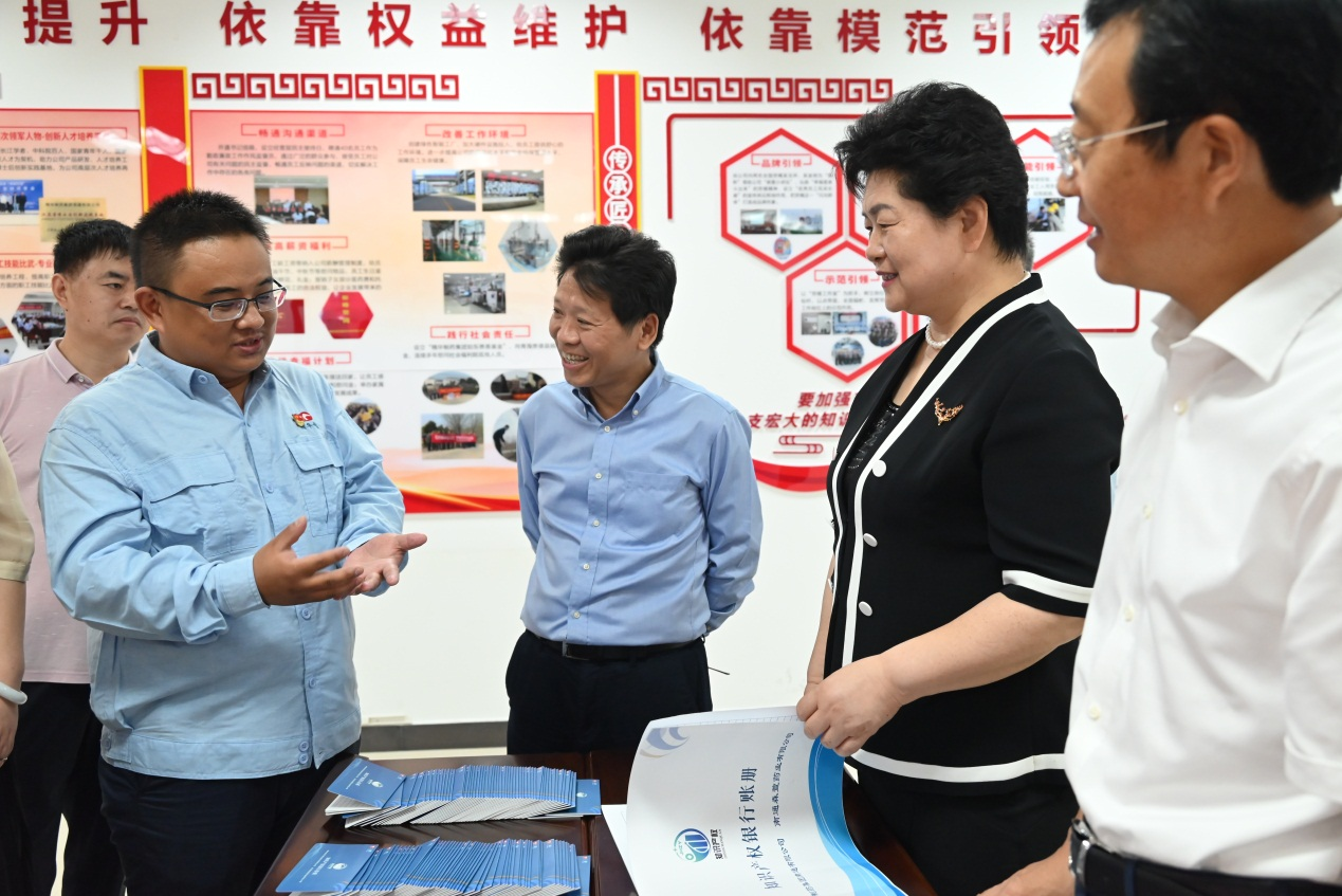 公司董事長、總經(jīng)理袁擁軍代表公司全體員工對蔡毅德一行表示熱烈的歡迎,并陪同參觀了公司黨群活動室、產(chǎn)改工作室,詳細(xì)介紹了在公司“五彩黨建”引領(lǐng)下,以“五個依靠、五心工程”為抓手開展的一系列產(chǎn)改工作。袁擁軍匯報了公司近年來在黨建工作、生產(chǎn)經(jīng)營、科技創(chuàng)新、人才培養(yǎng)、產(chǎn)業(yè)工人改革等方面取得的優(yōu)異成績。調(diào)研過程中,來訪人員饒有興趣的了解了公司 “員工幸福計(jì)劃”、“知識產(chǎn)權(quán)銀行”制度、“青藍(lán)工程”等亮點(diǎn)工作和做法,并給予高度肯定。袁擁軍向來訪人員贈送了由公司黨員和管理骨干開展讀書征文活動編撰的 “單位如家、感恩有我”、“奮斗如歌”、“責(zé)任如磐、攻堅(jiān)有我”系列叢書。