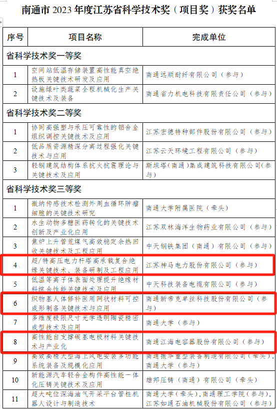近日,江蘇省人民政府公布《省政府關于2023年度江蘇省科學技術獎勵的決定》南通市共有18個項目榮獲2023年度江蘇省科學技術獎南通市產業(yè)投資母基金已投企業(yè)上榜4家。 其中,通富微電子股份有限公司榮獲江蘇省企業(yè)技術創(chuàng)新獎江蘇神馬電力股份有限公司、南通新帝克單絲科技股份有限公司、南通江海電容器股份有限公司各自參與的項目榮獲江蘇省科學技術獎(項目獎)三等獎。